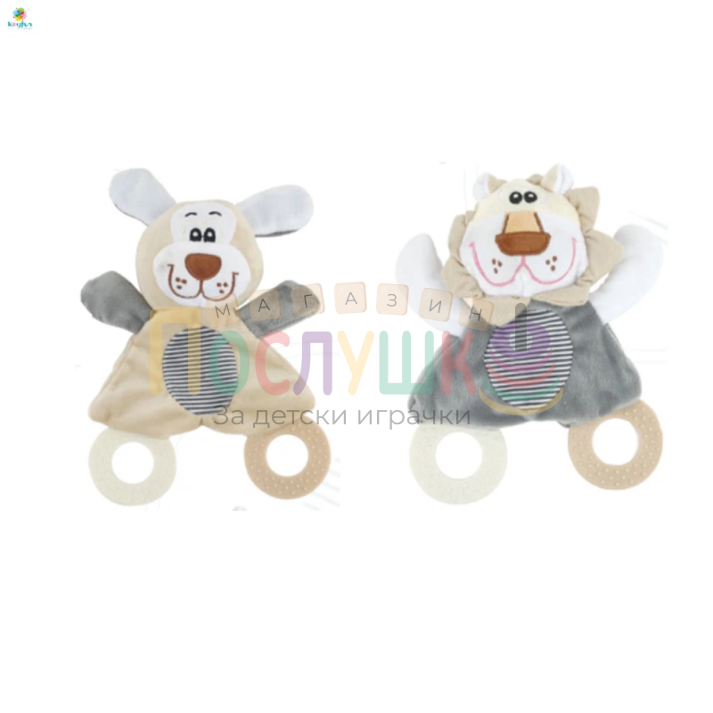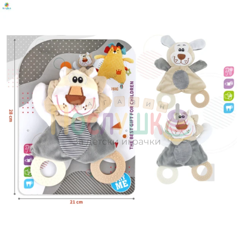 Мека шумоляща кърпичка с дизайн на лъв и куче, идеална за гушкане, успокояване и игра. Проектирана с внимание към нуждите на бебето, тя включва вградени гризалки и разнообразни текстури, които стимулират сетивата и фината моторика.