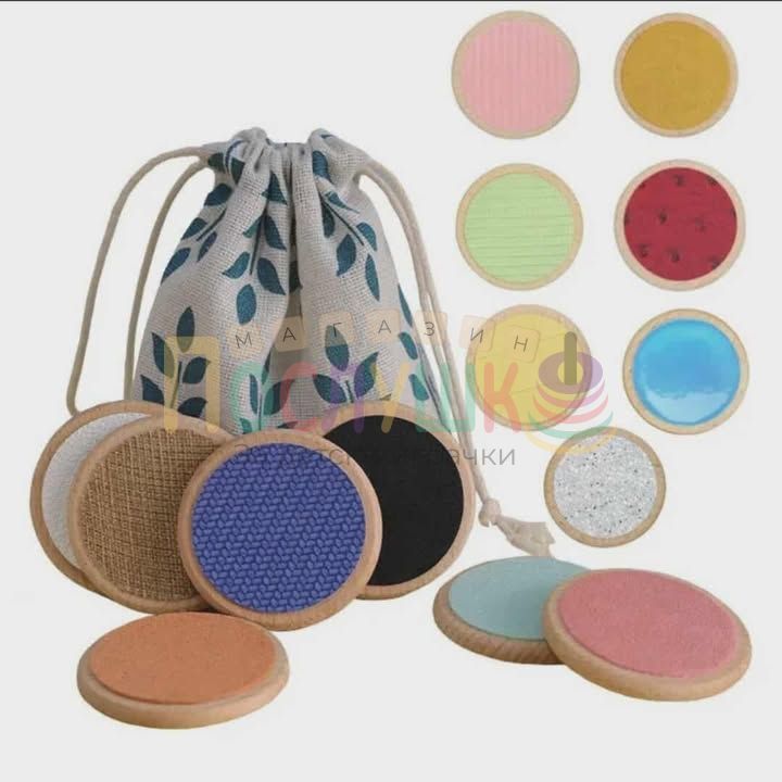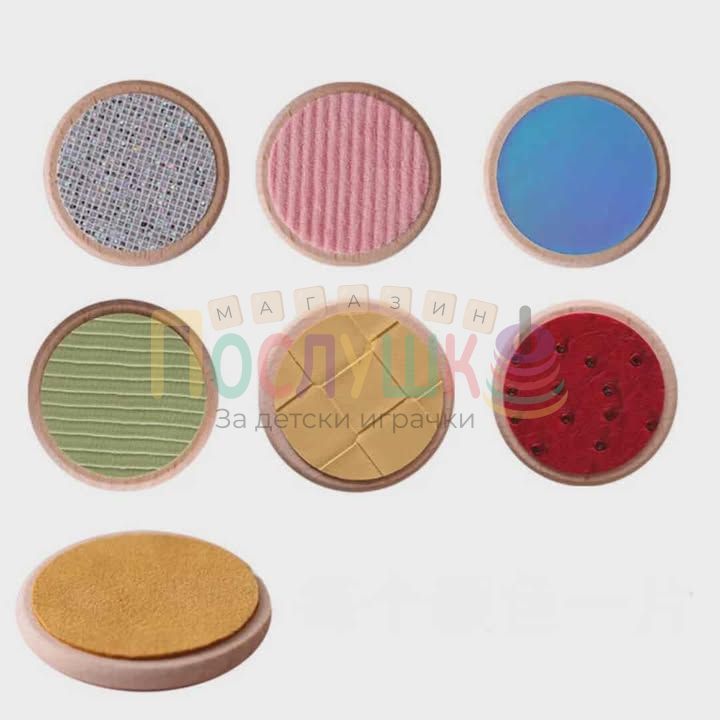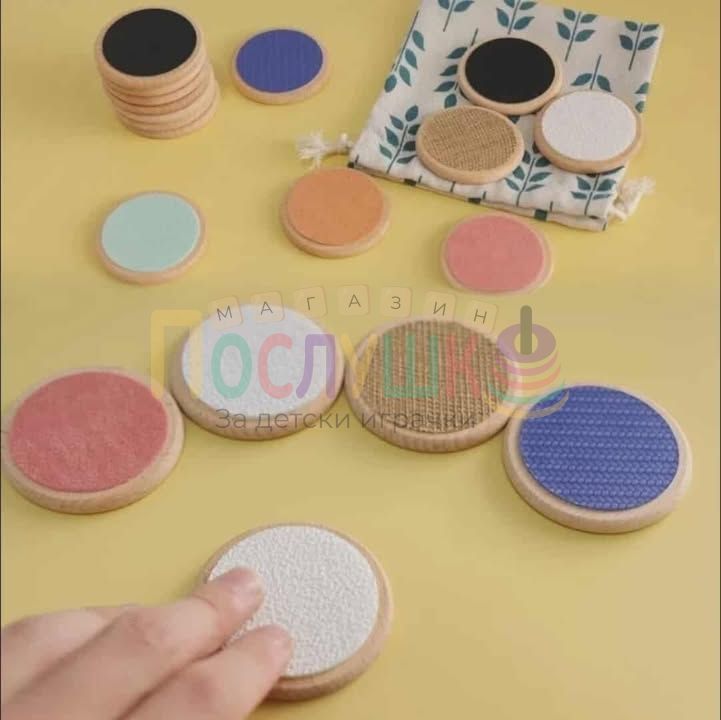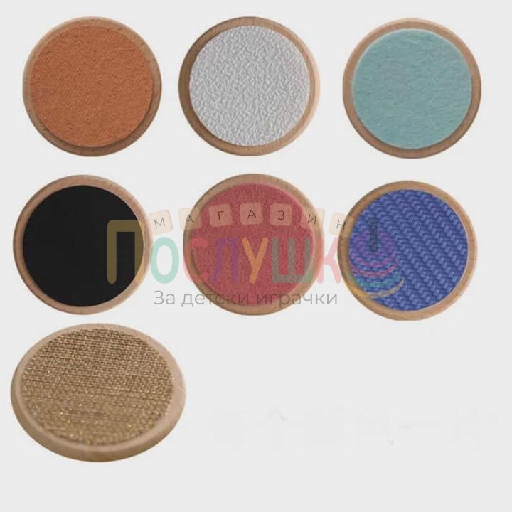 Представяме Ви монтесори сензорния комплект – играчка, която насърчава развитието на децата, като същевременно ги забавлява. Комплектът съдържа 14 дървени диска с различни текстури, които стимулират усещането на пръстите и помагат на малките да идентифицират форми и обекти. Играта е идеална за развитие на фина моторика и когнитивни умения чрез тактилни съвпадения и логическо мислене.