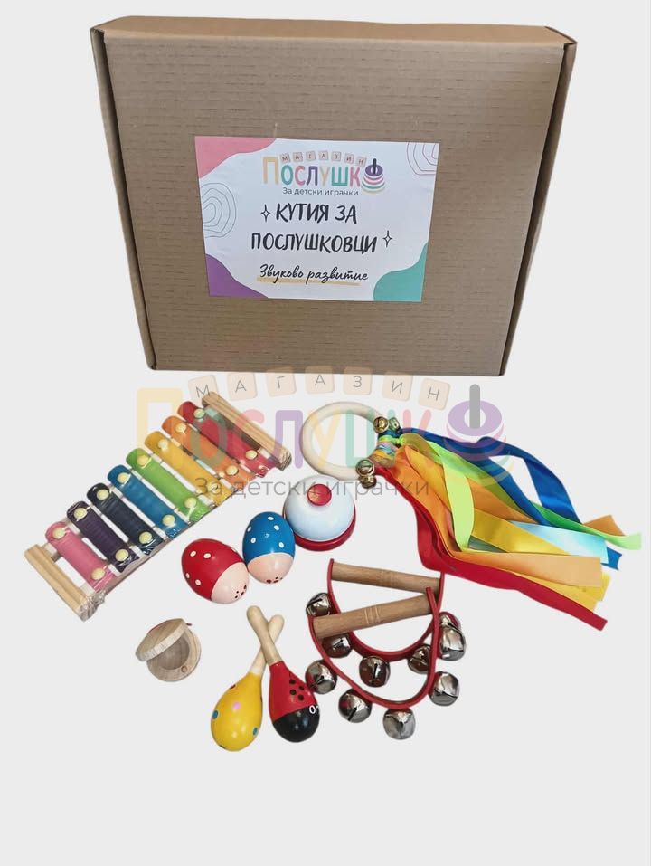 Представяме ви Кутията за звукова стимулация – комплект от 6 музикални инструмента, които ще събудят радост и движение в ежедневието на вашето дете. Звуковата стимулация е важен елемент в развитието на детето и оказва положително влияние върху слуховото възприятие, вниманието, езиковото развитие и координацията между слух и движение. Комплектът е създаден, за да насърчи децата да откриват звуците около себе си и да се учат чрез тях.
