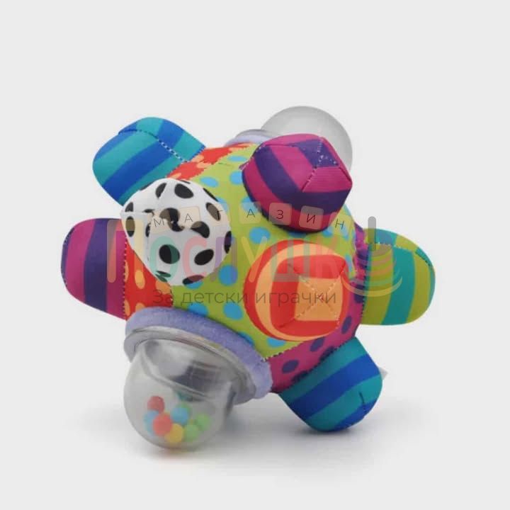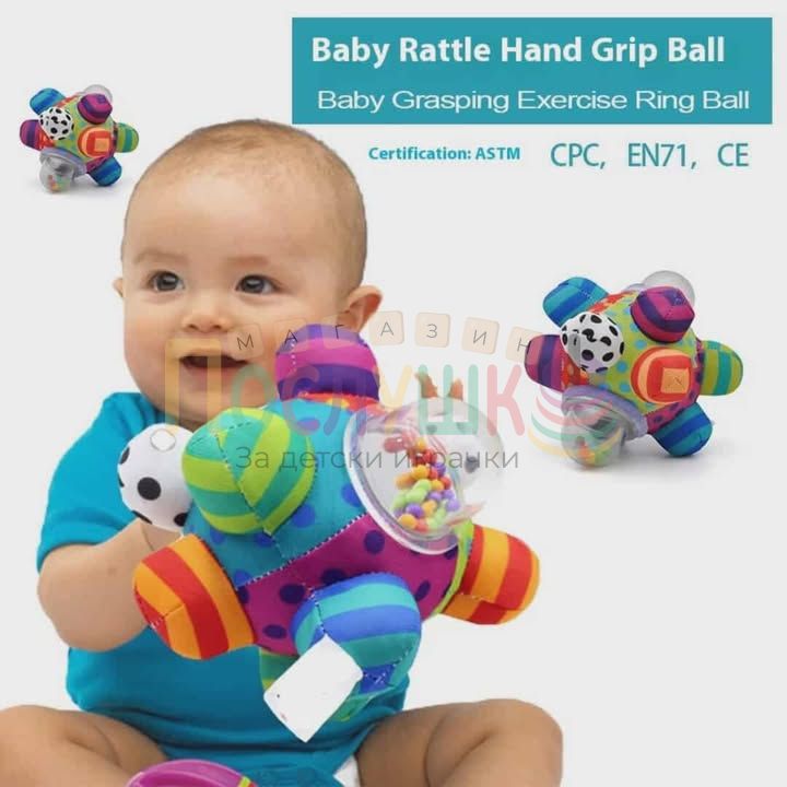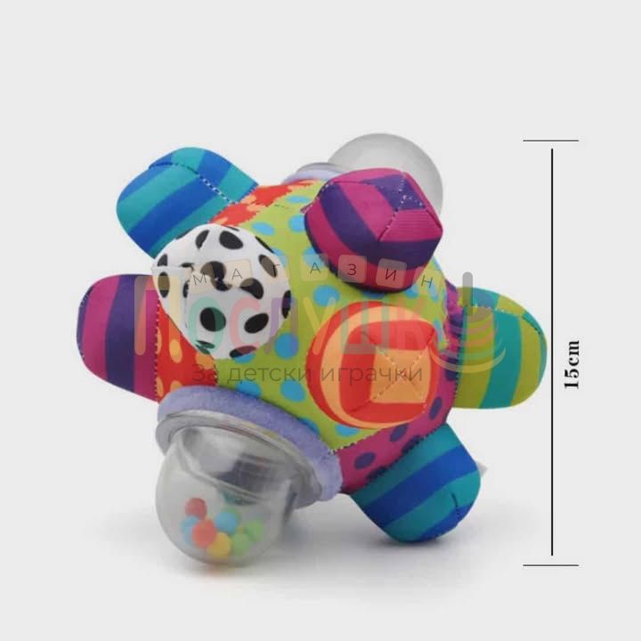 Меката цветна топка с дрънкалка е идеална за бебета от 3 месеца нагоре. Тази игриво цветна топка със звуци ще зарадва малките ушички на бебето, като стимулира слуховото възприятие и развитието на моторните умения чрез хващане и разклащане.