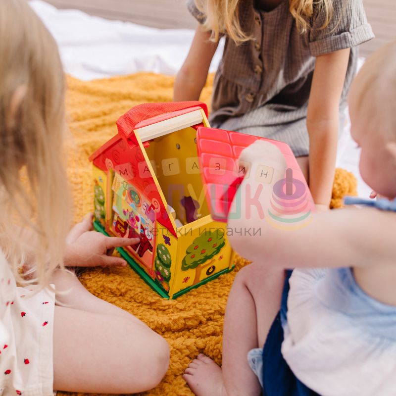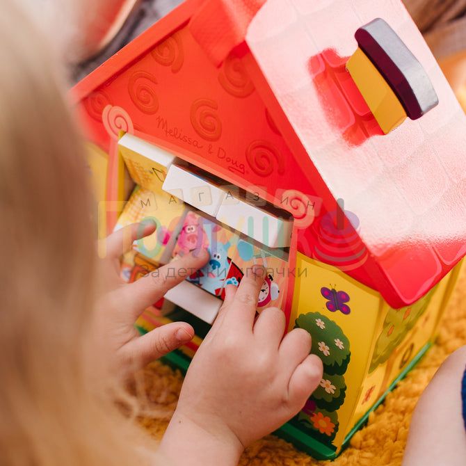 Тази чудесна дървена къщичка с активности от Melissa & Doug ще осигури часове забавление и полезни игри за вашето дете. Сортерът с цветни блокчета, зъбчатите колела и двустранният пъзел ще развият логиката и фината моторика на малчуганите.