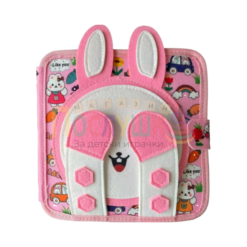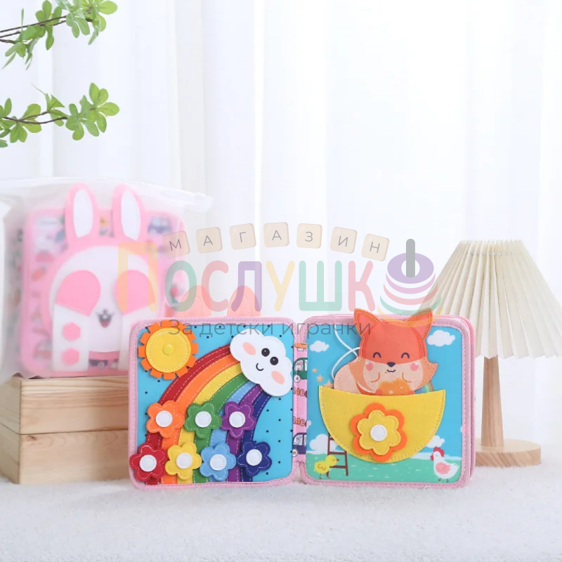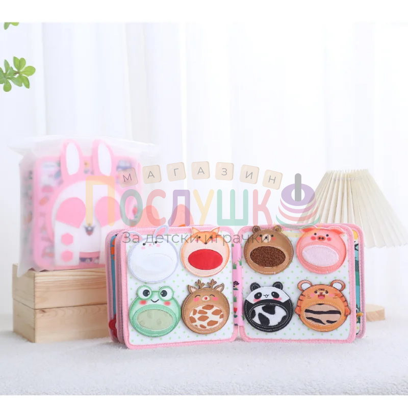 Тази книжка проектирана да превърне всяка страница в забавна и образователна игра. С многоцветен дизайн в розови нюанси и тематични детайли, тя предлага на детето комбинация от докосване, разглеждане и изследване. Страниците включват разнообразни тактилни и подвижни елементи, които стимулират сетивата и любопитството.