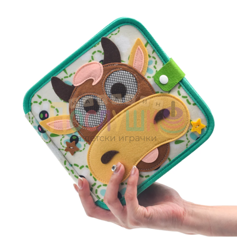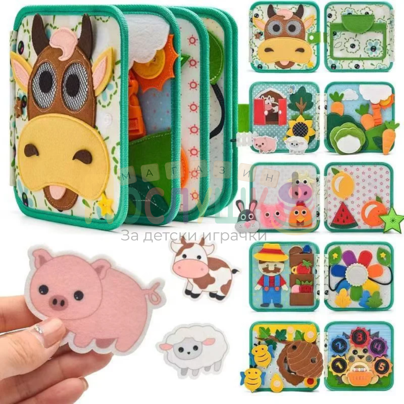 • Комплектът включва: мека текстилна книжка с 10 различни страници, всяка с образователни и сензорни елементи като бутони, лепящи и подвижни елементи и различни форми.