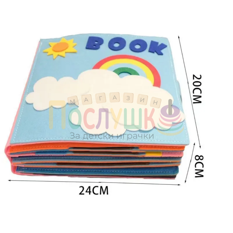 Голямата текстилна сензорна книжка „Дъга“ е цветна и забавна образователна играчка, която съчетава мекота, безопасност и интерактивно учене. Създадена по принципите на Монтесори педагогиката, тя предлага множество занимания за развитие на сетивата, фината моторика и концентрацията на детето.