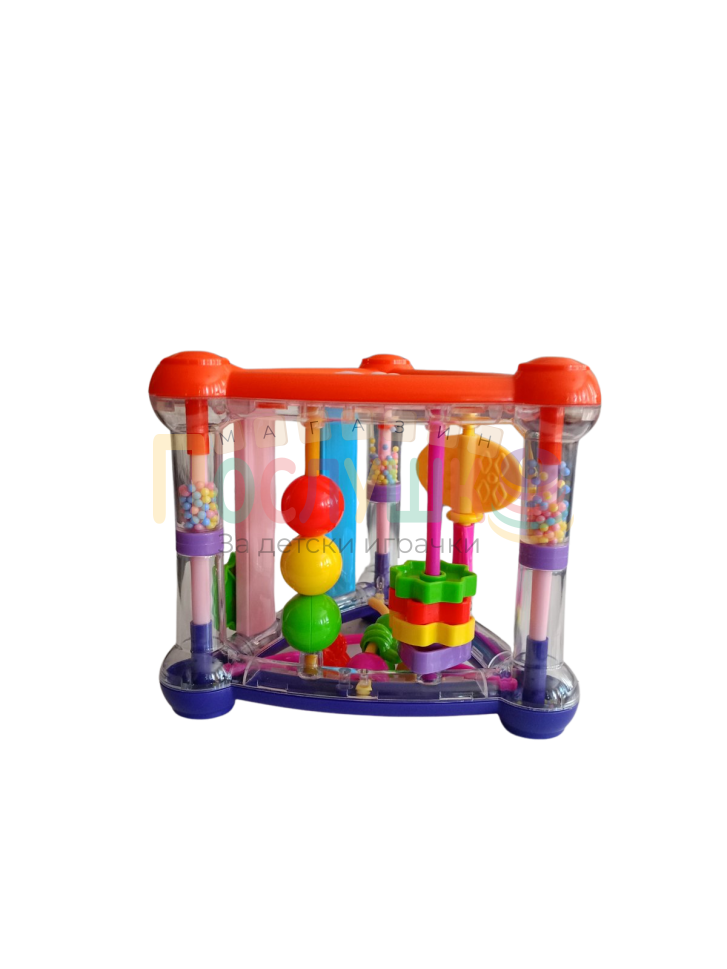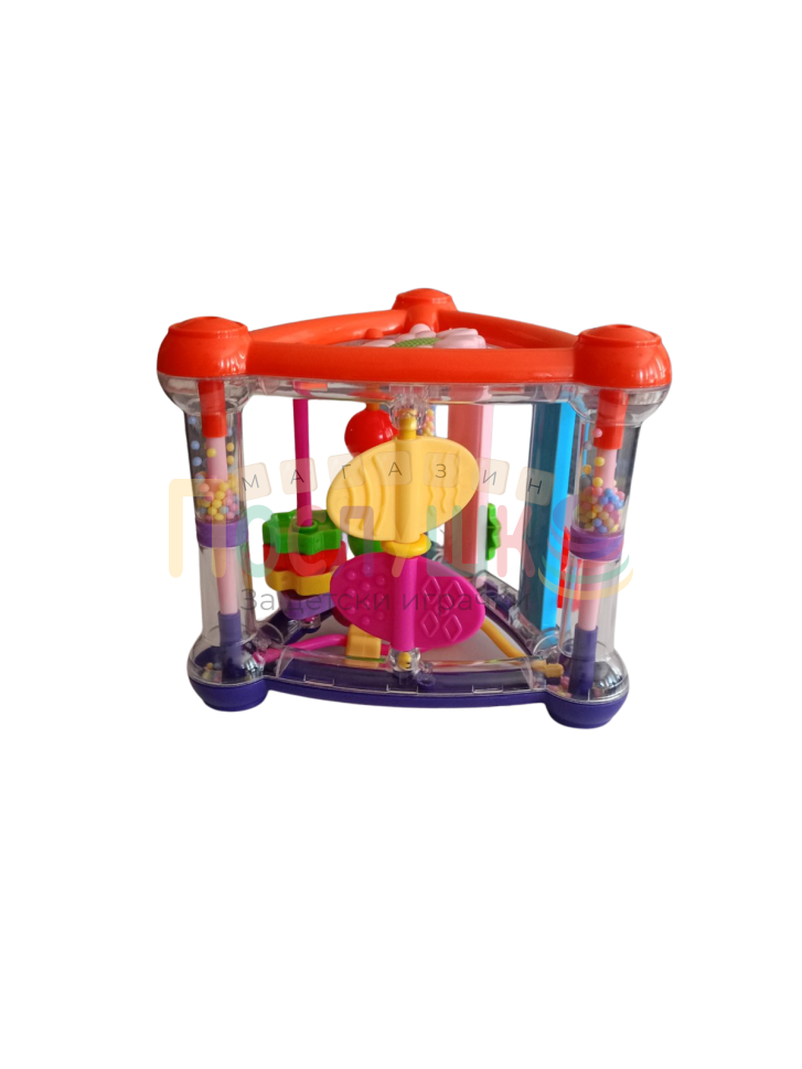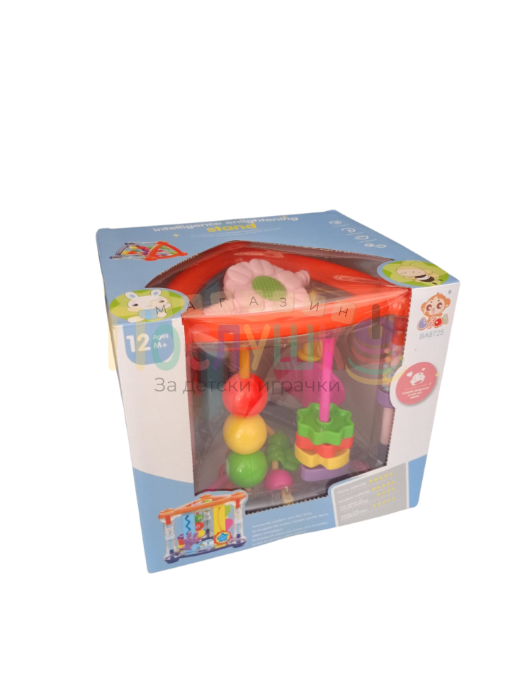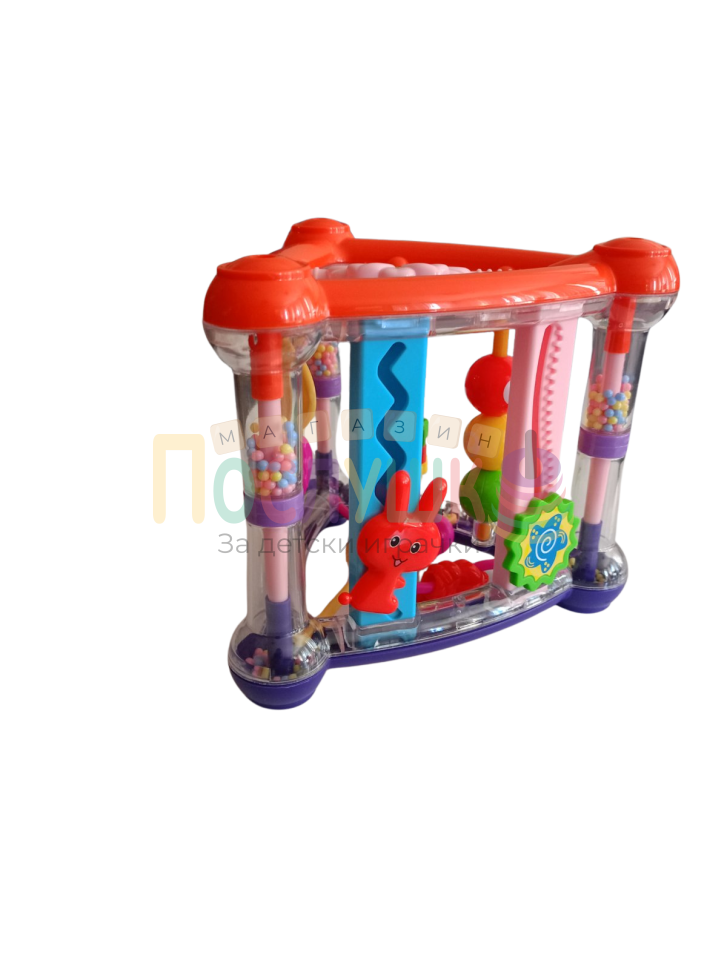 Този куб предлага 5 различни равнини с активности: въртящи се топки с числа, форми като триъгълник, квадрат и звезда, животински фигурки (заек и пчела), зигзаг пътеки и огледално цвете, което привлича вниманието и насърчава оригинална игра. Играта стимулира сетивата, концентрацията и любопитството на детето, като същевременно осигурява забавление и обучение в домашна среда.