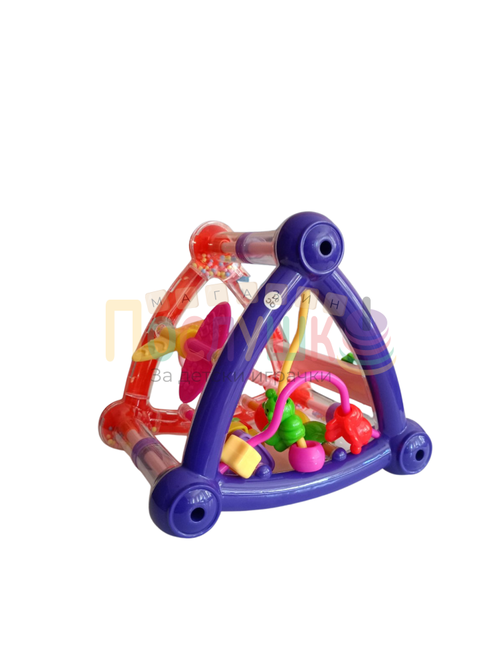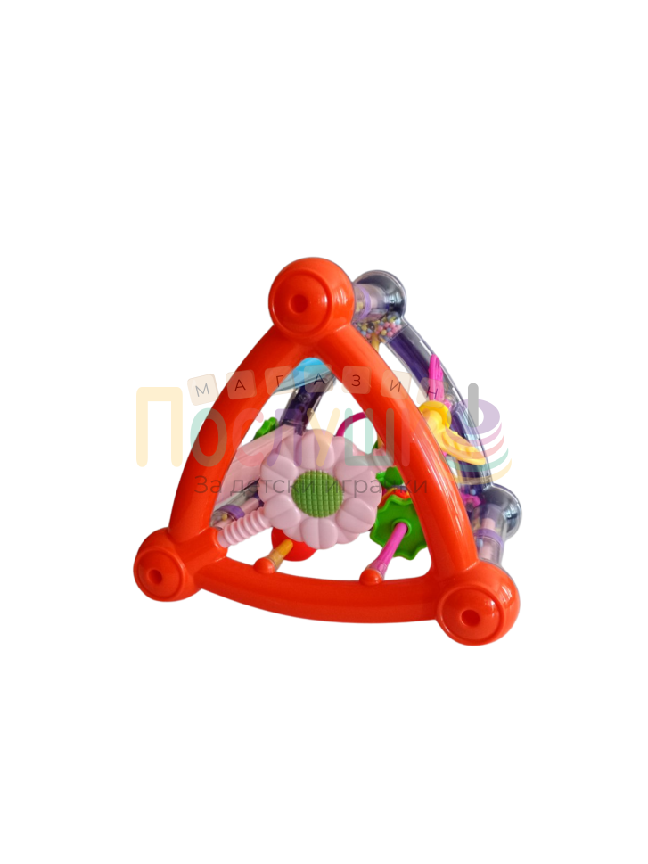 Занимателният триъгълник е създаден да ангажира бебето по забавен и интерактивен начин, като подпомага развитието на фината моторика, визуалното възприятие и уменията за разпознаване. Благодарение на ярките цветове, различните форми и забавните дрънчещи елементи, малкото дете се учи да хваща, бута и манипулира предметите, докато развива координация с две ръце.